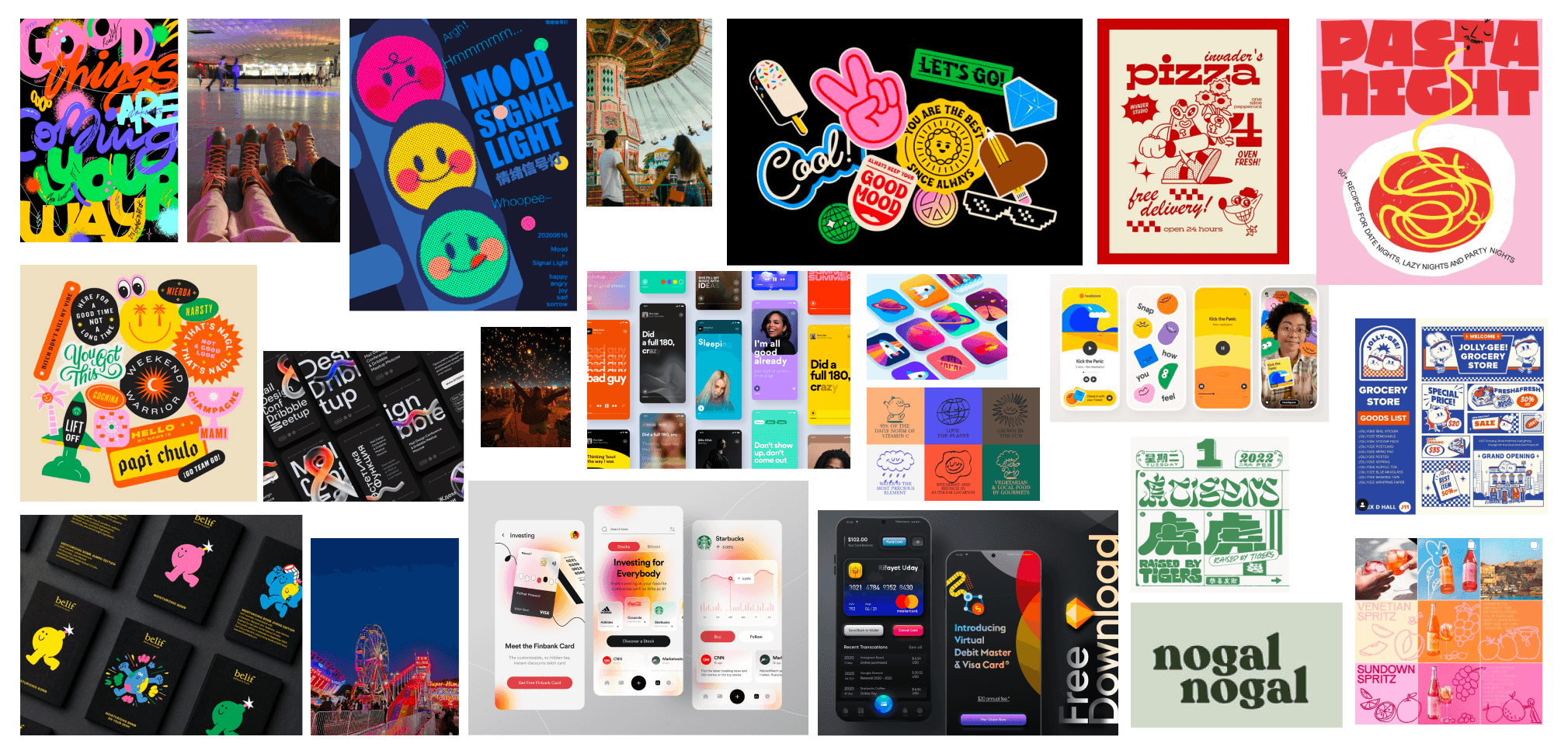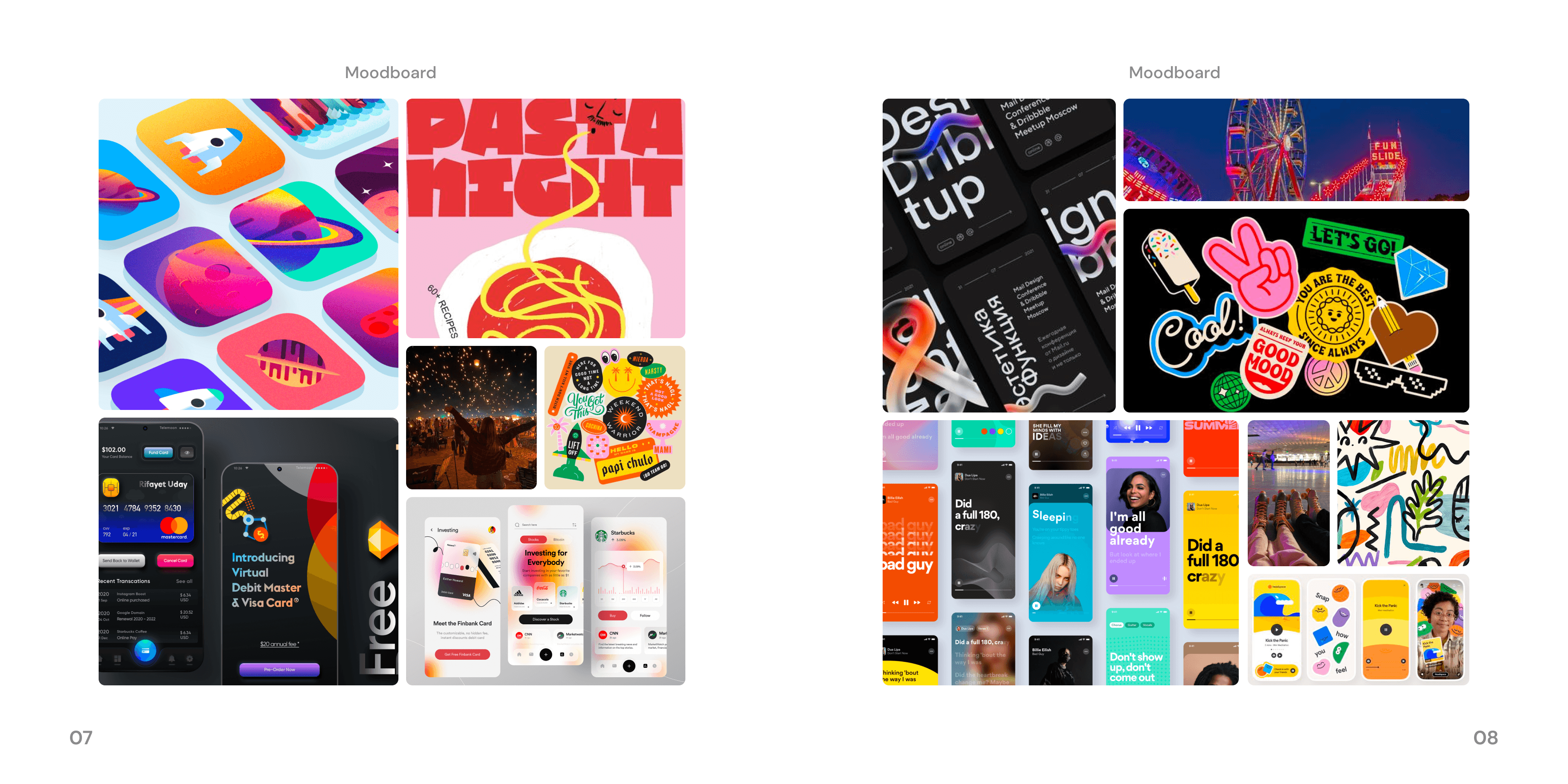 Moodboard: Creating a moodboard was vital in learning what direction to take our project in. We wanted our app to be fun and inviting for everyone to try out, but still be able to stand out against competitors. We created a moodboard with a focus on bright colors, bold text, gradients, and fluid shapes.