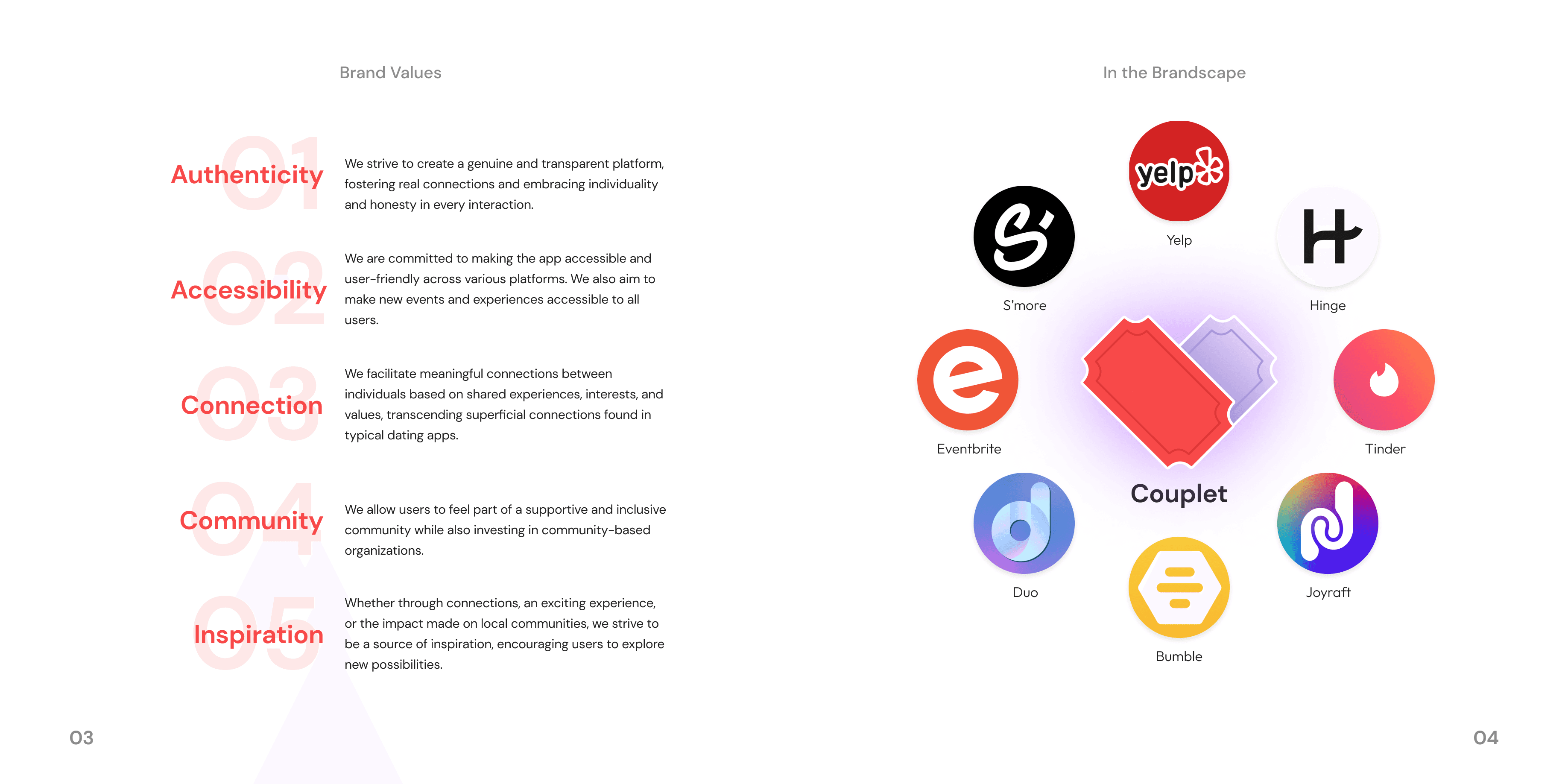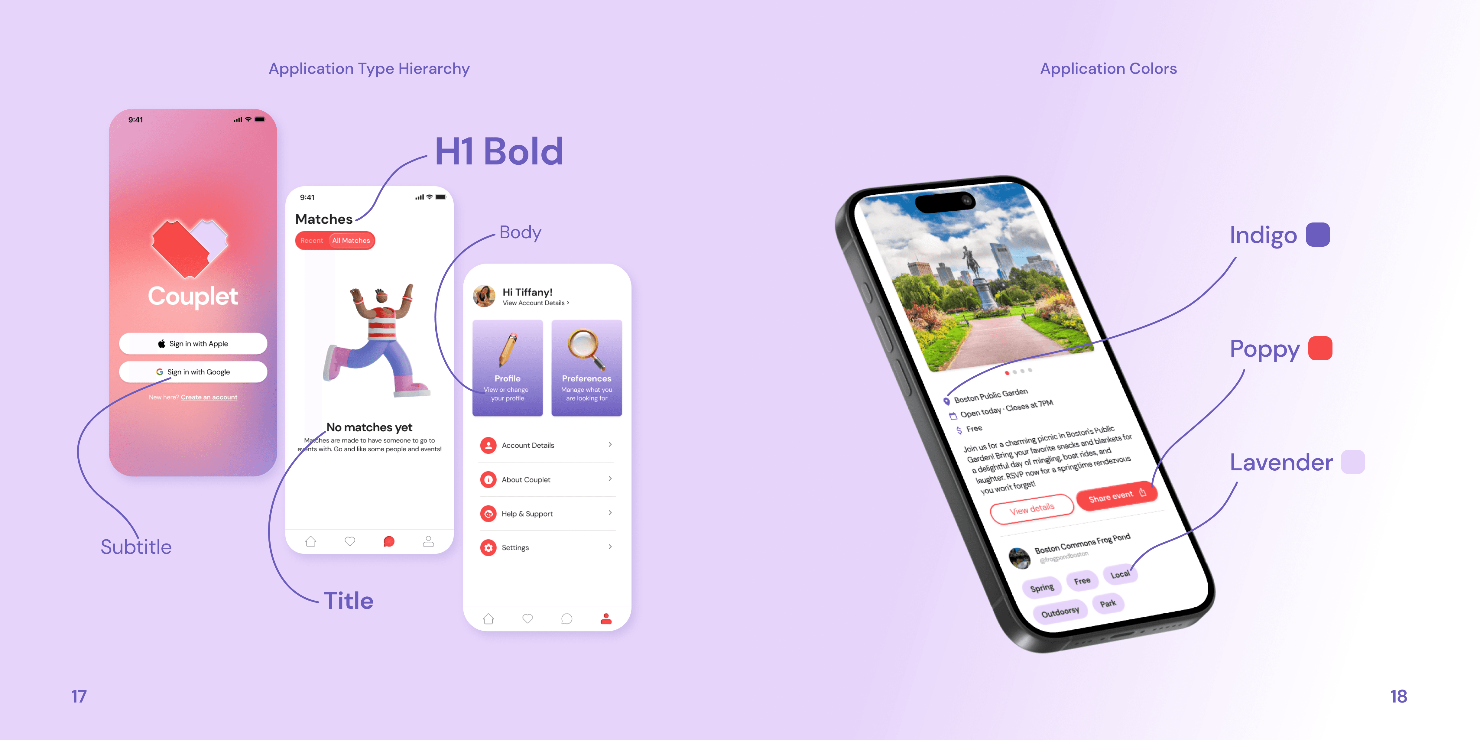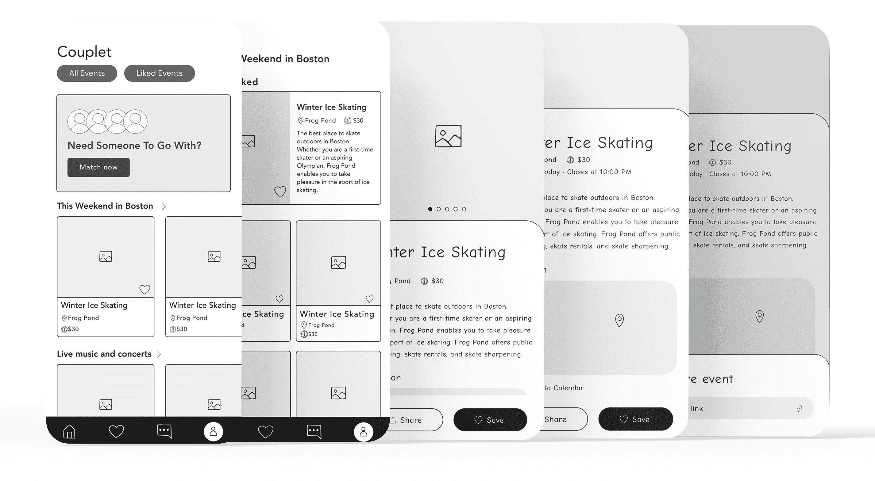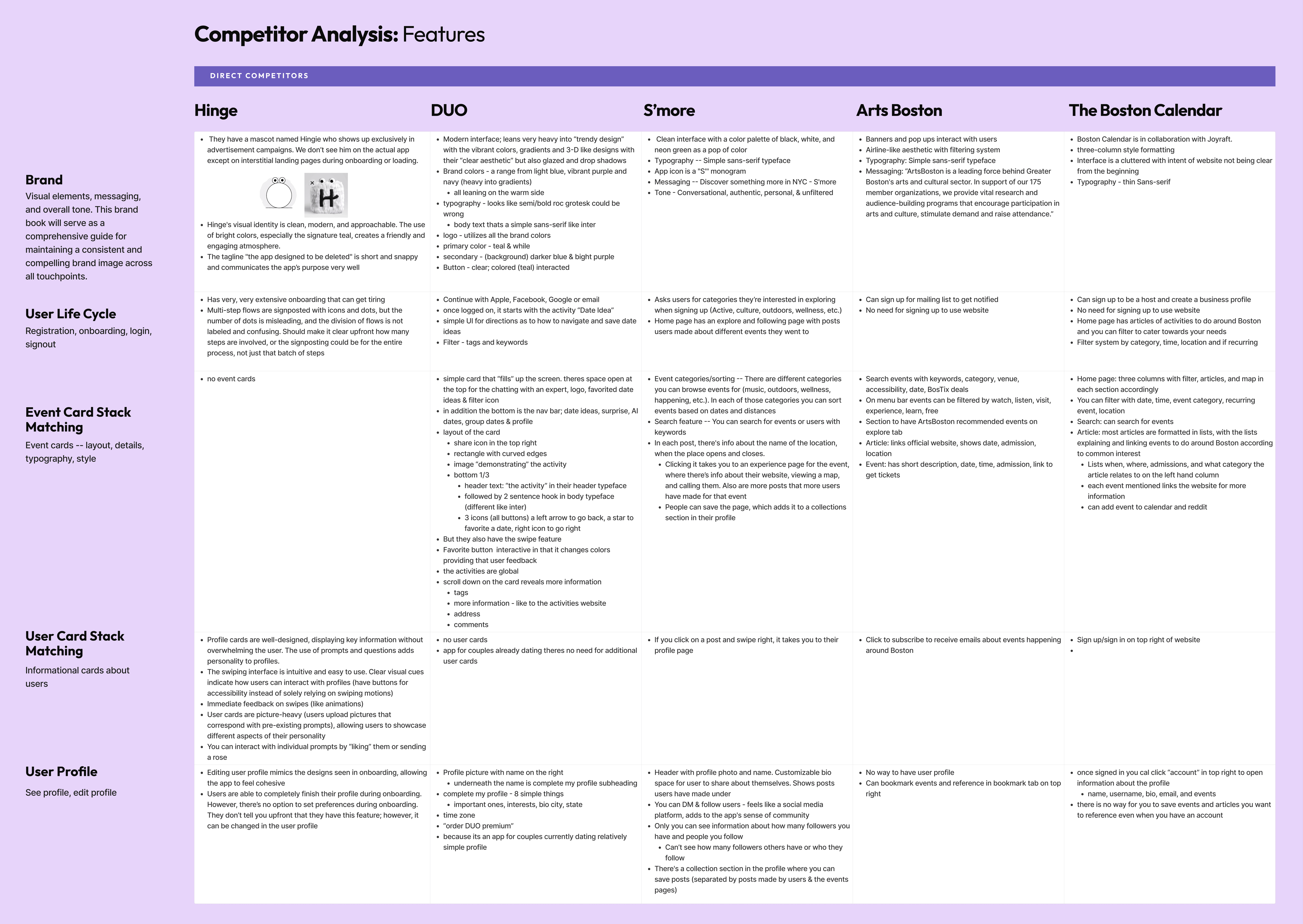 Competitor Analysis: I led a competitor analysis where each designer examined a dating or event-based app, documenting its features and usability strengths. This helped us understand user expectations and gaps in the current market, allowing us to refine Couplet’s unique value proposition.