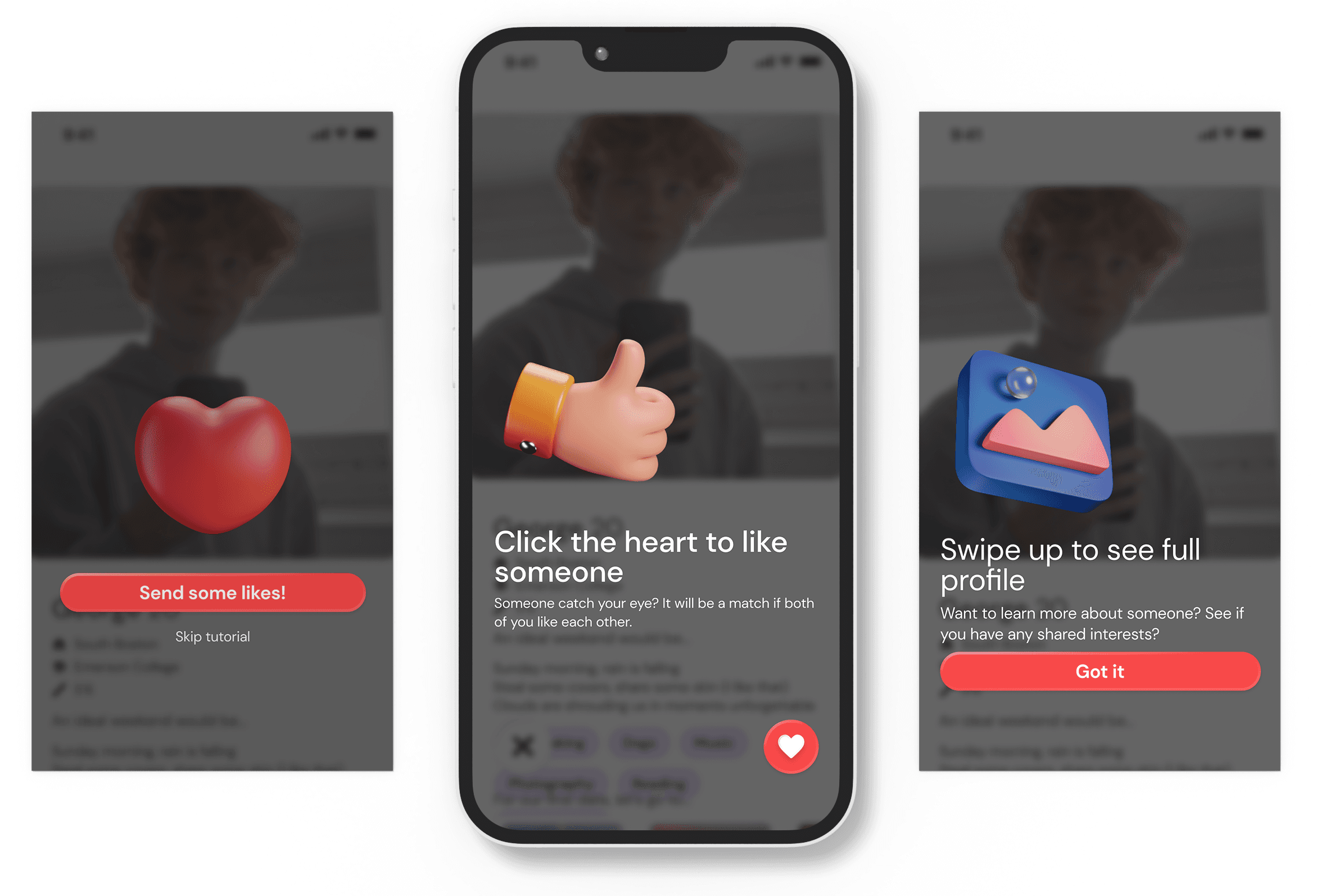 - A rotating, blurred image of potential matches not only piques curiosity but also encourages users to swipe on profiles, tying in the matchmaking component with event discovery.