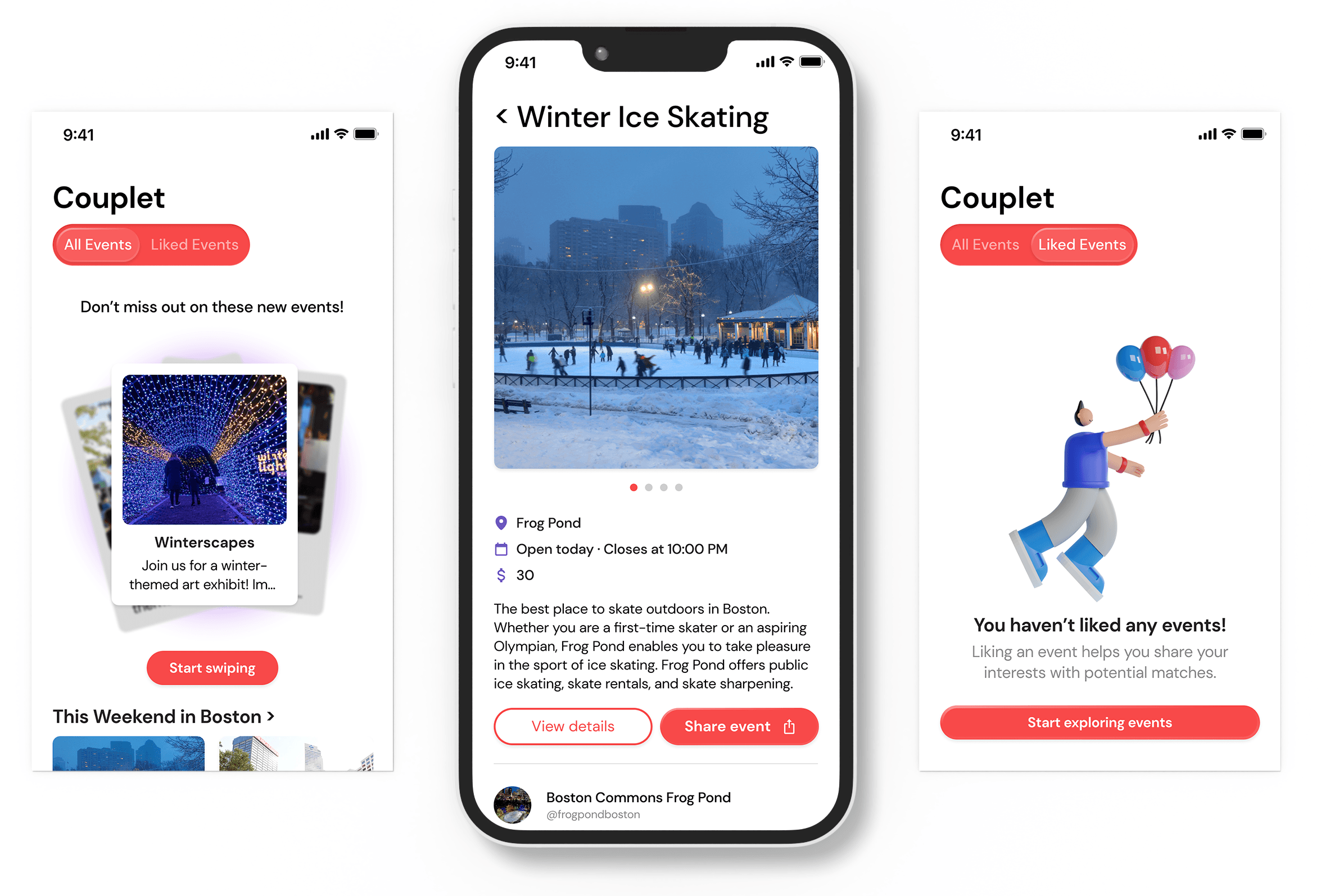 Proposed Solution: Traditional dating apps prioritize superficial interactions, leading to unsatisfactory user experiences. Additionally, local cultural events struggle with visibility and engagement. Couplet addresses both issues by connecting people through shared interests in events by integrating event data from sources like ArtsBoston.