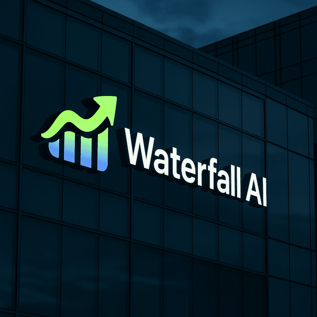The Waterfall AI mark combines upward motion, data flow, and clarity.